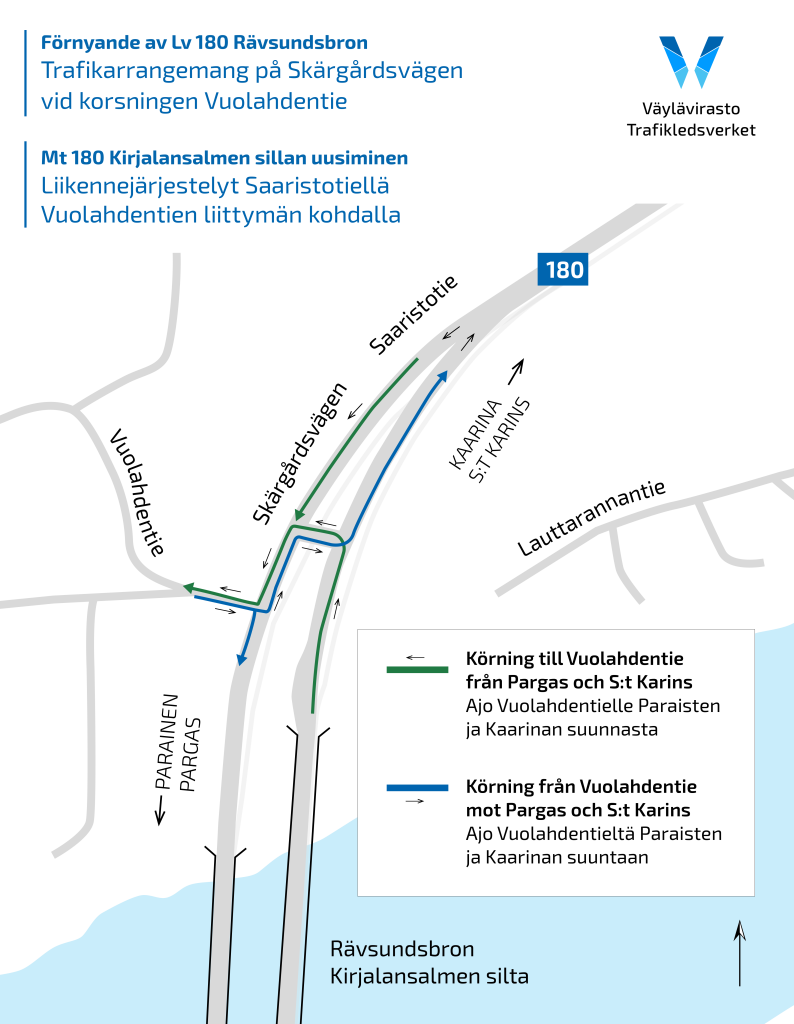 Liikennejärjestelyt muuttuvat hetkellisesti lokakuussa myös Vuolahdentieltä Saaristotielle ajettaessa. Liikennejärjestelyt on opastettu tiedotteen Väyläviraston verkkosivuilla ladattavassa kartassa.