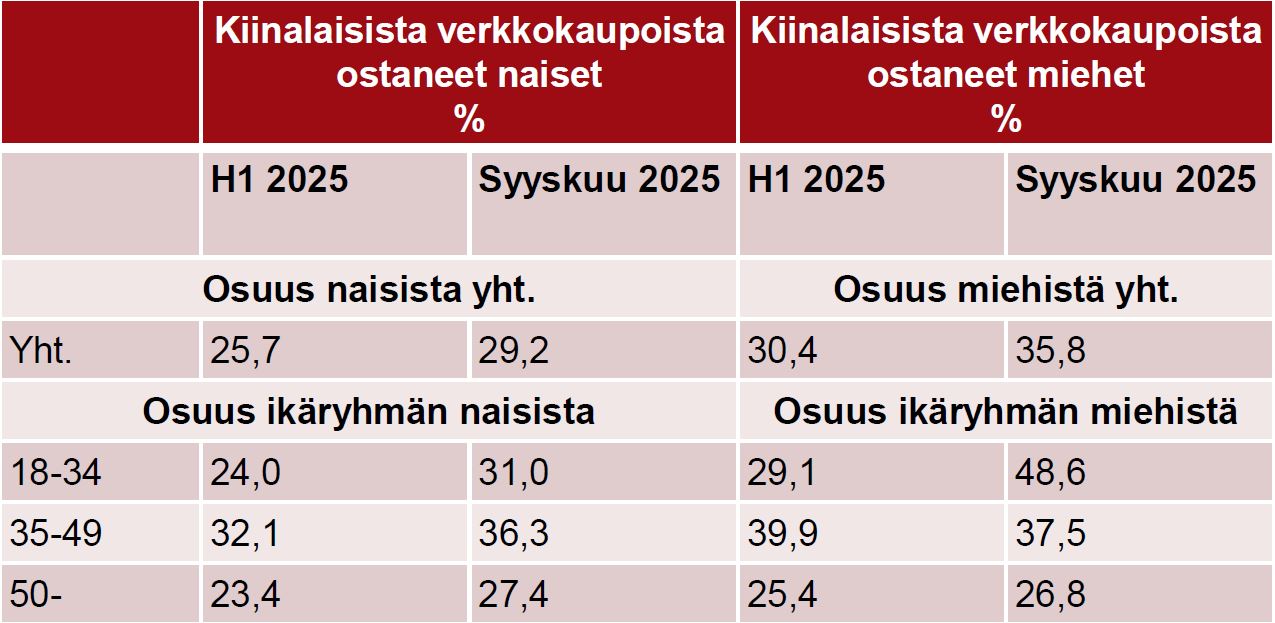 Miehistä jo lähes 36 prosenttia ostaa kiinalaisista verkkokaupoista tai -alustoilta. Naisista runsaat 29 prosenttia tekee verkko-ostoksia Kiinasta.