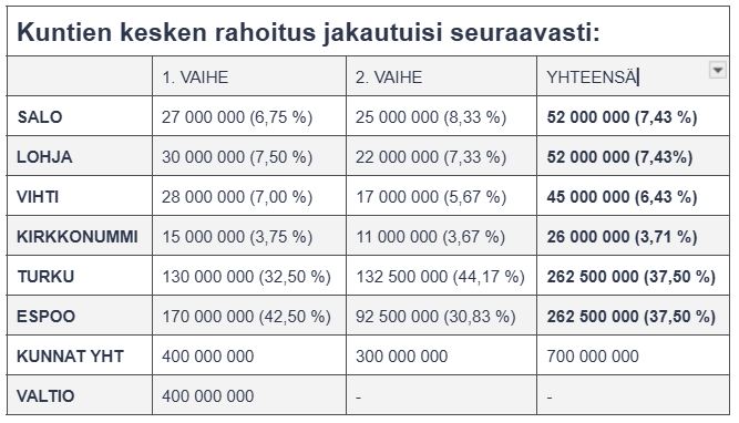Osakkaat sitoutuvat rahoittamaan hanketta enintään 800 miljoonalla eurolla, josta valtio kattaisi 400 miljoonaa euroa ja kuntaomistajat 400 miljoonaa euroa.