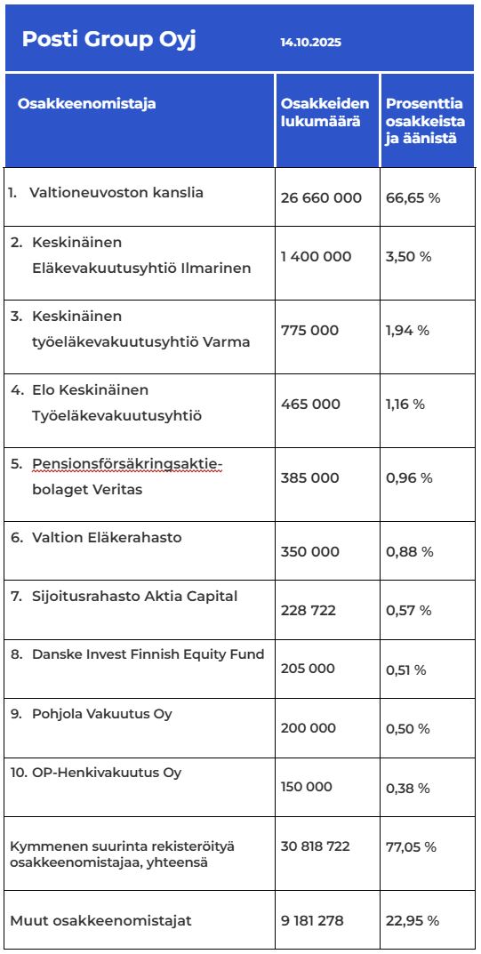 Osakkeenomistajien omistustiedot esitetään osakasluettelon 14.10.2025 tietojen perusteella eivätkä tiedot sisällä hallintarekisteröityjä osakkeenomistajia eivätkä henkilöstöannissa merkittyjä.