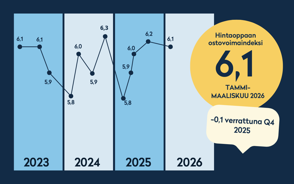 Hintaoppaan ostovoimaindeksi laski hieman edellisestä neljänneksestä lukemaan 6,1, mutta lasku on pienempi kuin kahtena edellisenä vuotena.